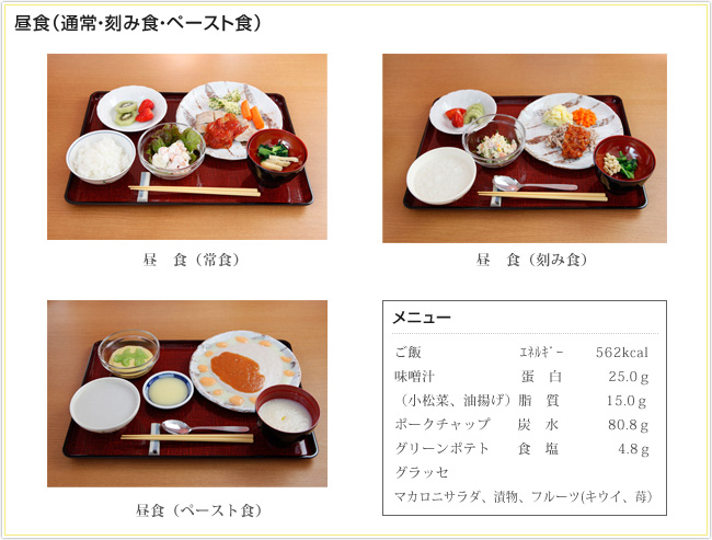 - 3. きざみ食、ペースト食、医療食などのご希望があるかたは、職員にご相談ください。